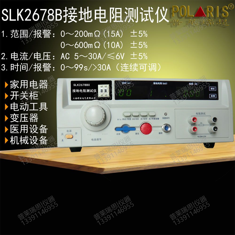 SLK2678BX系列接地电阻测试仪是按照GB﹑IEC﹑ISO﹑BS﹑UL﹑JIS等国际国内的安全标准而设计的,接地电阻的指标是衡量各种电气设备安全性能的重要指标之一。它是在大电流(25A或10A)的情况下对接地回路的电阻进行测量,同时也是对接地回路承受大电流指标的测试,以避免在绝缘性能下降(或损坏)时对人身的伤害。本测试仪是为满足以上要求为生产车间及实验部门提供高性能测试仪器而开发生产的。本仪器对供电电压要求不高,测量精度高,速度快,使用方便,特别适用于要求高的实验室和自动检测线上使用。断路报警选择功能(即开路报警)可以方便地知道仪器是否工作在正常测试状态,用户可以根据实际需要选择是否需要此项功能。本仪器采用三位半数字显示,读数方便,采用优化设计,整机具有极高的可靠性和稳定性。