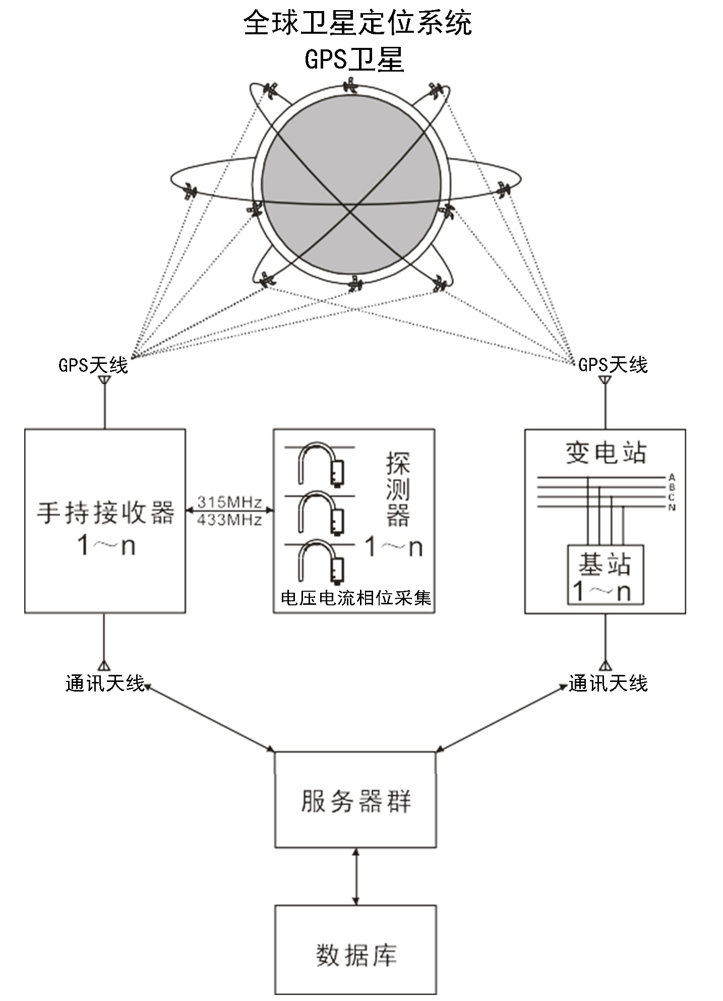 本产品整套系统及设备由全球卫星定位系统、基站群、服务器群、物联网通讯模块、数据库、RF 无线通讯模块、手持接收器、探测器(采集器)、天线、物联卡、伸缩绝缘杆等组成。