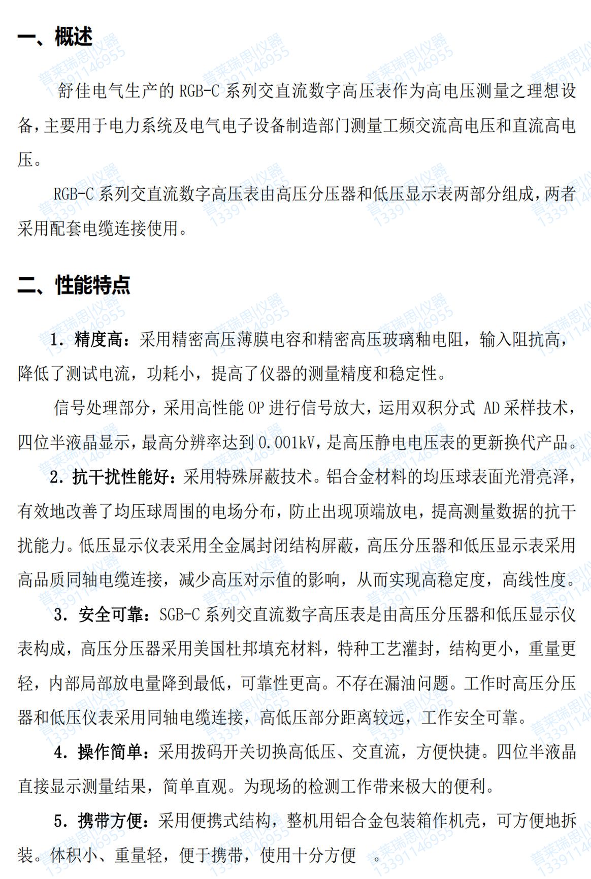 1.精度高:采用精密高压薄膜电容和精密高压玻璃釉电阻,输入阻抗高,降低了测试电流,功耗小,提高了仪器的测量精度和稳定性。信号处理部分,采用高性能 OP 进行信号放大,运用双积分式 AD 采样技术,四位半液晶显示,最高分辨率达到 0.001kV,是高压静电电压表的更新换代品。