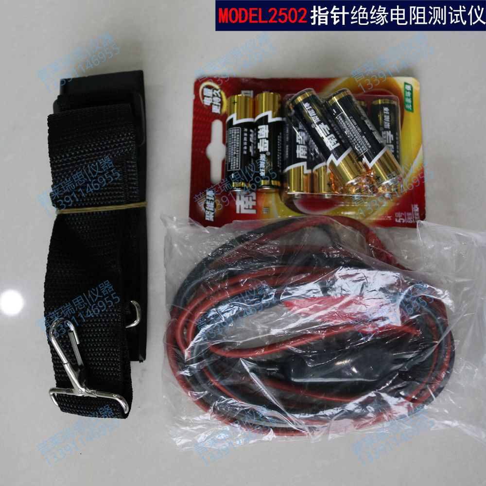 附件 :铝合金(5000V/10000V)或工程塑料(5000V以下)包装箱,(8节1.5V五号碱性电池,测试导线,产品说明合格证)各一份,测试线2根,高压线棒(连在表上)1付;