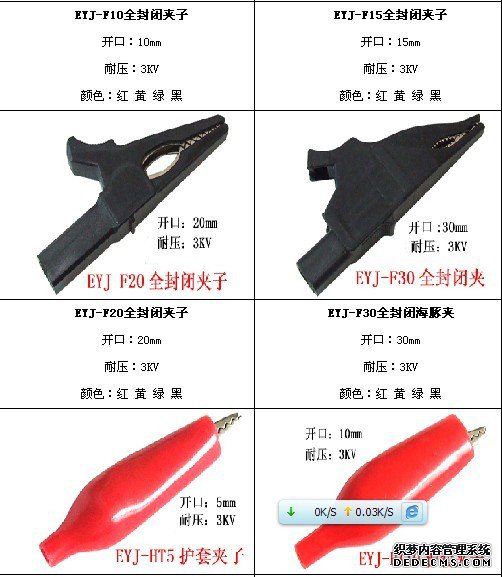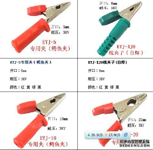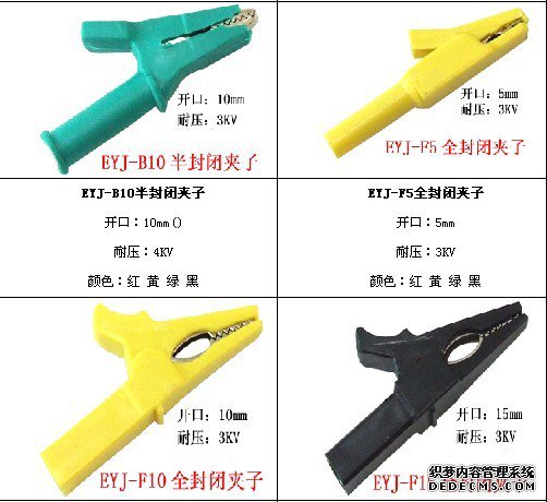 EYJ系列鳄鱼夹所用材料为进口ABS塑料和铜进过精制加工而成,质量可靠。常规颜色分为红、黄、绿、黑、量大可以定制其他颜色