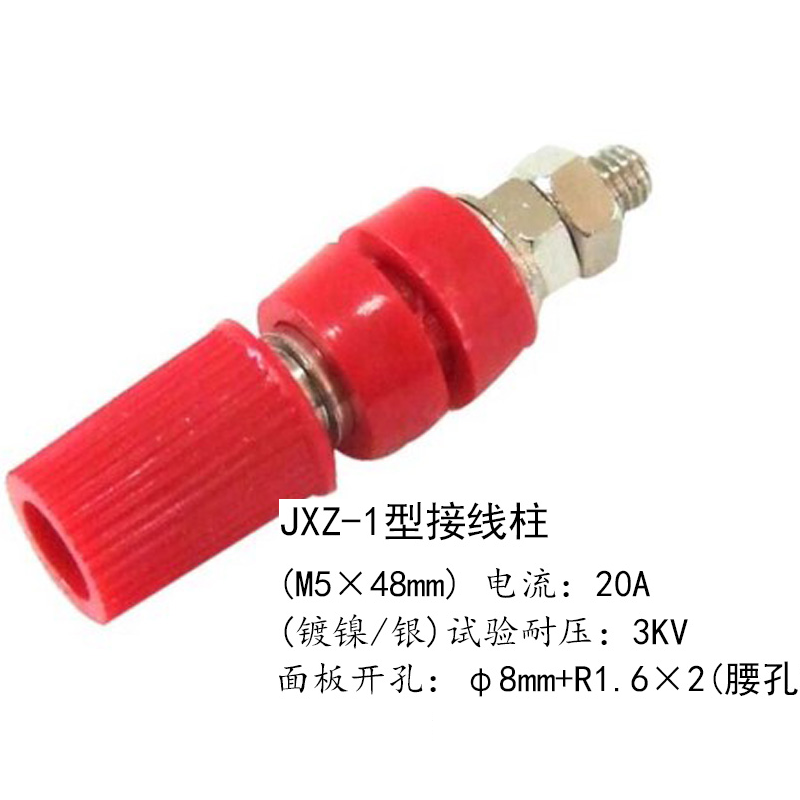 JXZ-1型接线柱规格:(M5×48mm)电:20A (镀镍/银)插孔:φ4m耐压:3KV面板开孔:φ8mm+R1.6×2(腰孔)