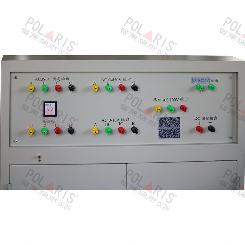 输入电源:三相四线AC380V 1、三相AC100V输出(固定值) 2、三相AC 0 – 10A输出(〈25V,可调值〉 3、单相24V、36V、110V、220V直流固定输出 4、交流操作电压输出AC 0 – 400V,电流小于10A 5、