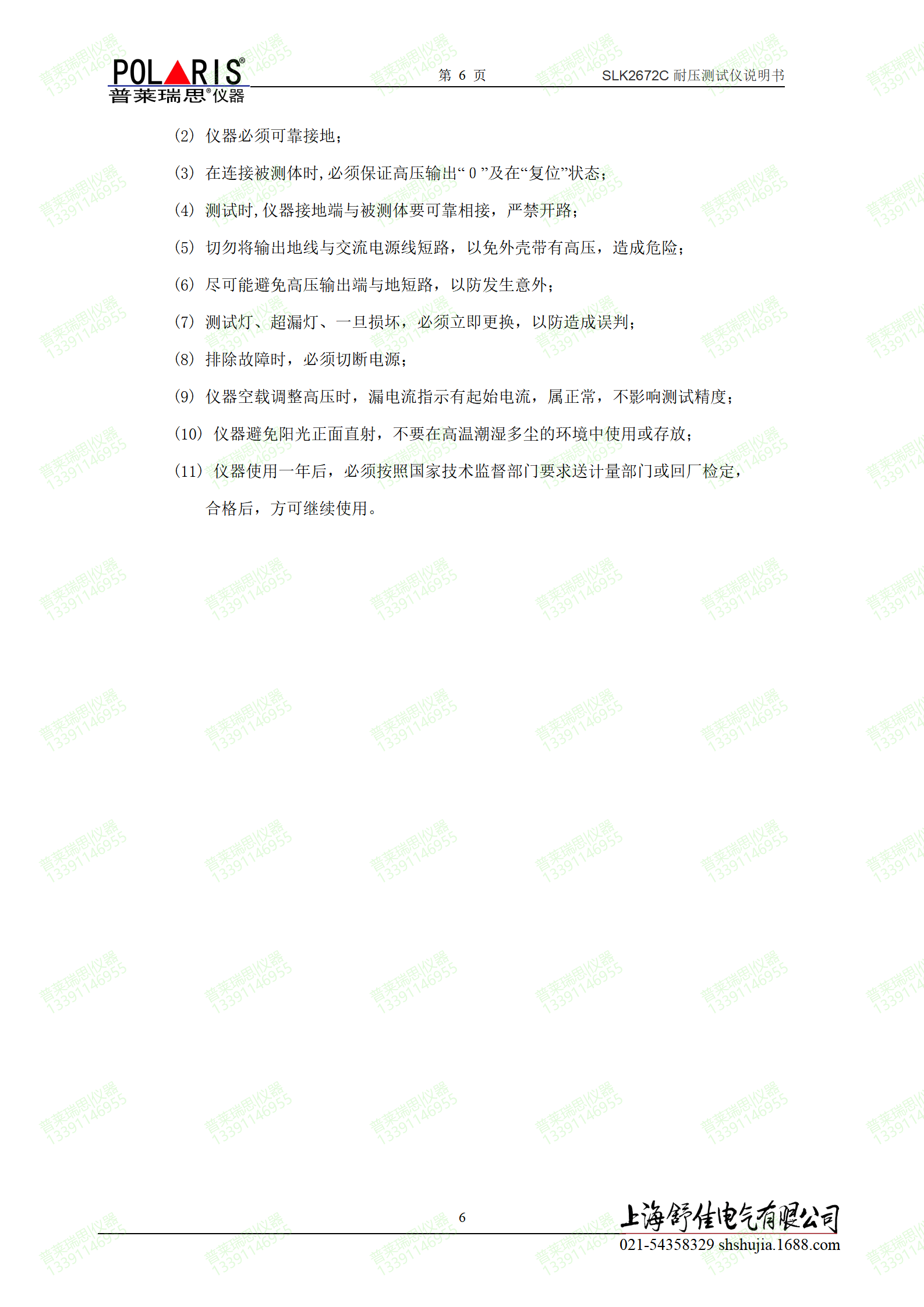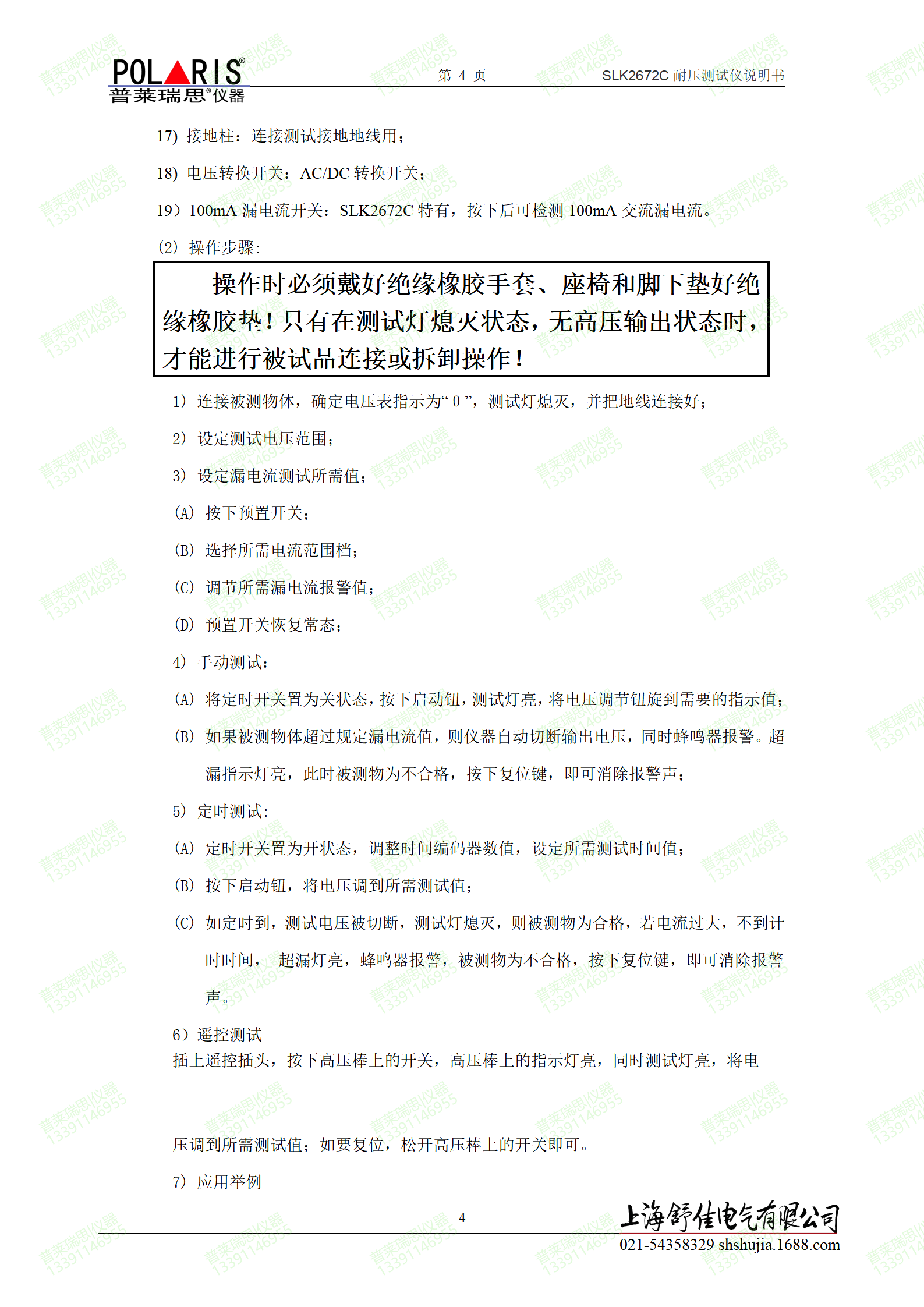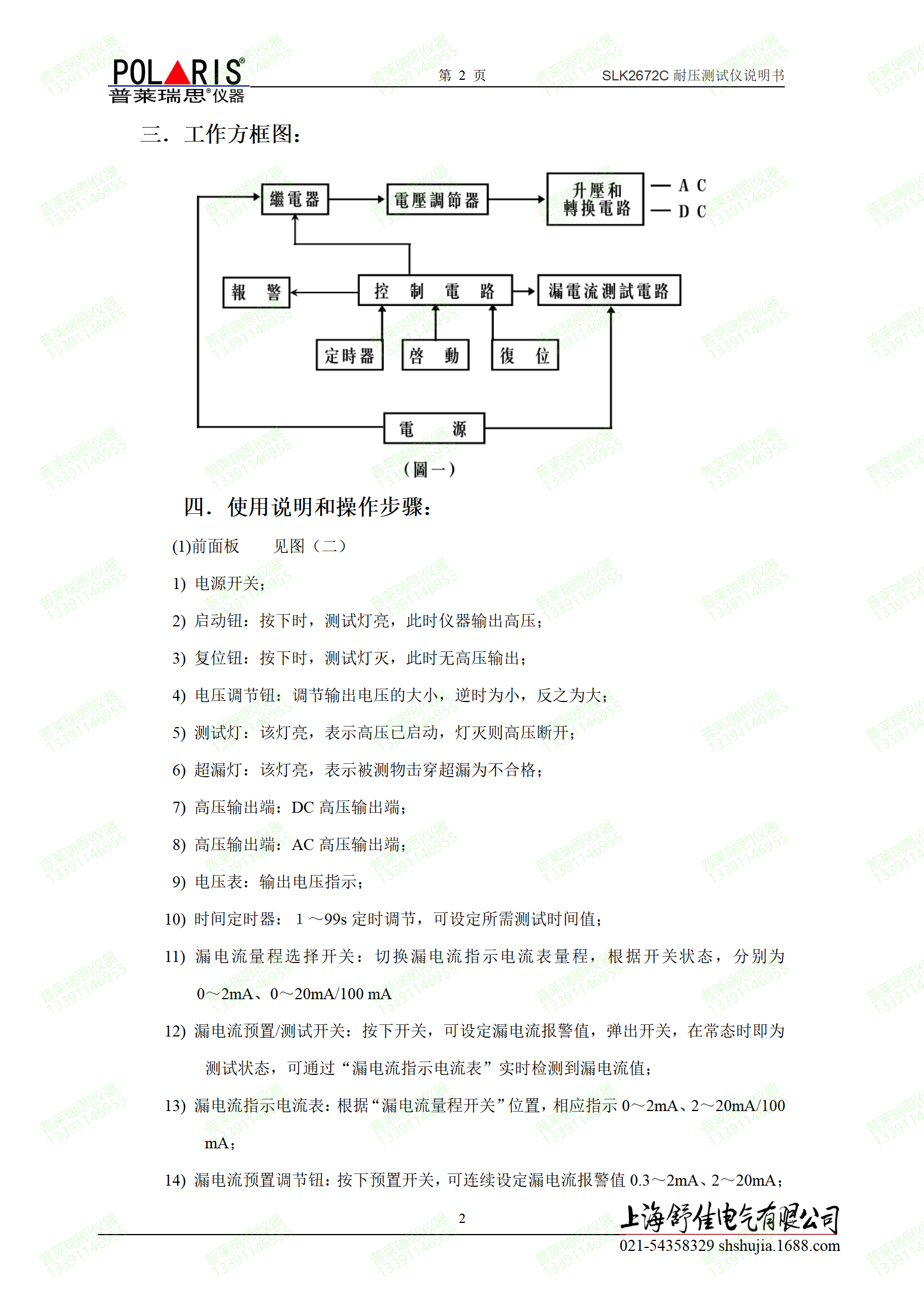 (1)电压测试:AC/DC:0~5KV (2)漏电流测试:AC:2~2mA、20~100 mA  (3)漏电流报警值预置范围:      AC:2~2mA  20~100 mA  (4)时间测试:1~99s,连续设定和手动 (5)变压器容量: 750VA(SLK2672C) (6)电源:198~242VAC