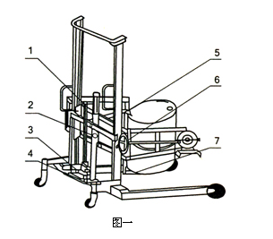 COT350型可倾式油桶搬运车(见图一)设计新颖,结构合理,使用方便,适用于工厂、车间、仓库、油库的油桶装卸、搬运、堆垛。油桶提升后,可以在空中作大于180度的翻转,停留作业,特别适用于化工、食品车间材料或配料使用,并可用于在汽车上进行油桶的装卸和堆垛。