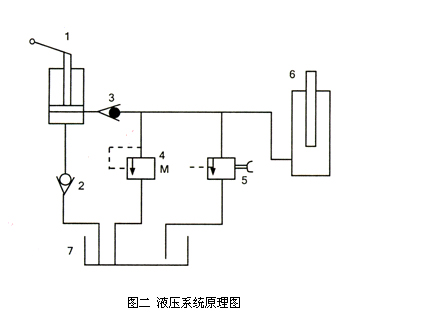 4、液压系统原理如图二所示,泵和柄往上提,使得油箱内的压力油推开单向阀②进入小油泵,手柄往下压,使得小油泵内的压力油推开单向阀③压入大油缸⑥推动柱塞杆上升顶起重物,手柄上下不停地动作,货叉即不断上升,当手柄停止动作,货叉即停在某一位置,慢慢左旋拧松卸荷阀⑤油缸中的压力油流回油箱⑦使货物下降。 5、应在坚硬、平整的路面上使用,防止和钢板、角料、铁屑及其它损害车分界线的物体相碰;在货物起升过程中,附近不准站人,维修和调整时应将货物放下,在搬运行走时,应尽量降低货叉高度行走。